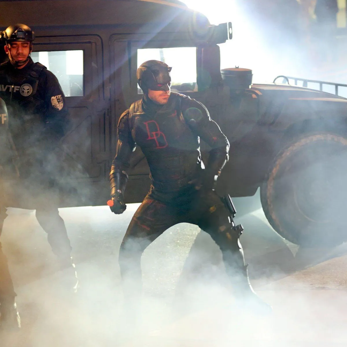 🔴 لوگوی قرمز رنگ DD روی سینه دردویل با بازی چارلی کاکس دیده میشود و در این صحنه، او ظاهراً در حال نبردی اکشن با نیروهای ضد ویجلنتی ویلسون فیسک است.